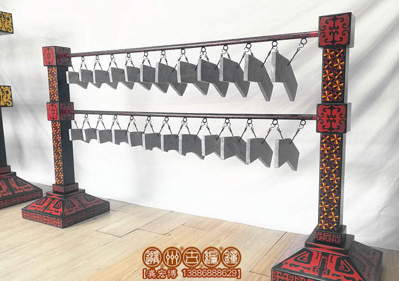隨州市古編鐘文化發(fā)展有限公司通過考證歷史資料進行研究分析,并八方尋找石源,終于將這套2400多年前的戰(zhàn)國初期大型編磬復制出來,其發(fā)音與原編磬的標音銘文相符,低音渾厚洪高,高音明澈,音色優(yōu)美而動聽,音域達三個八度,可以旋宮轉(zhuǎn)調(diào),演奏多種樂曲。